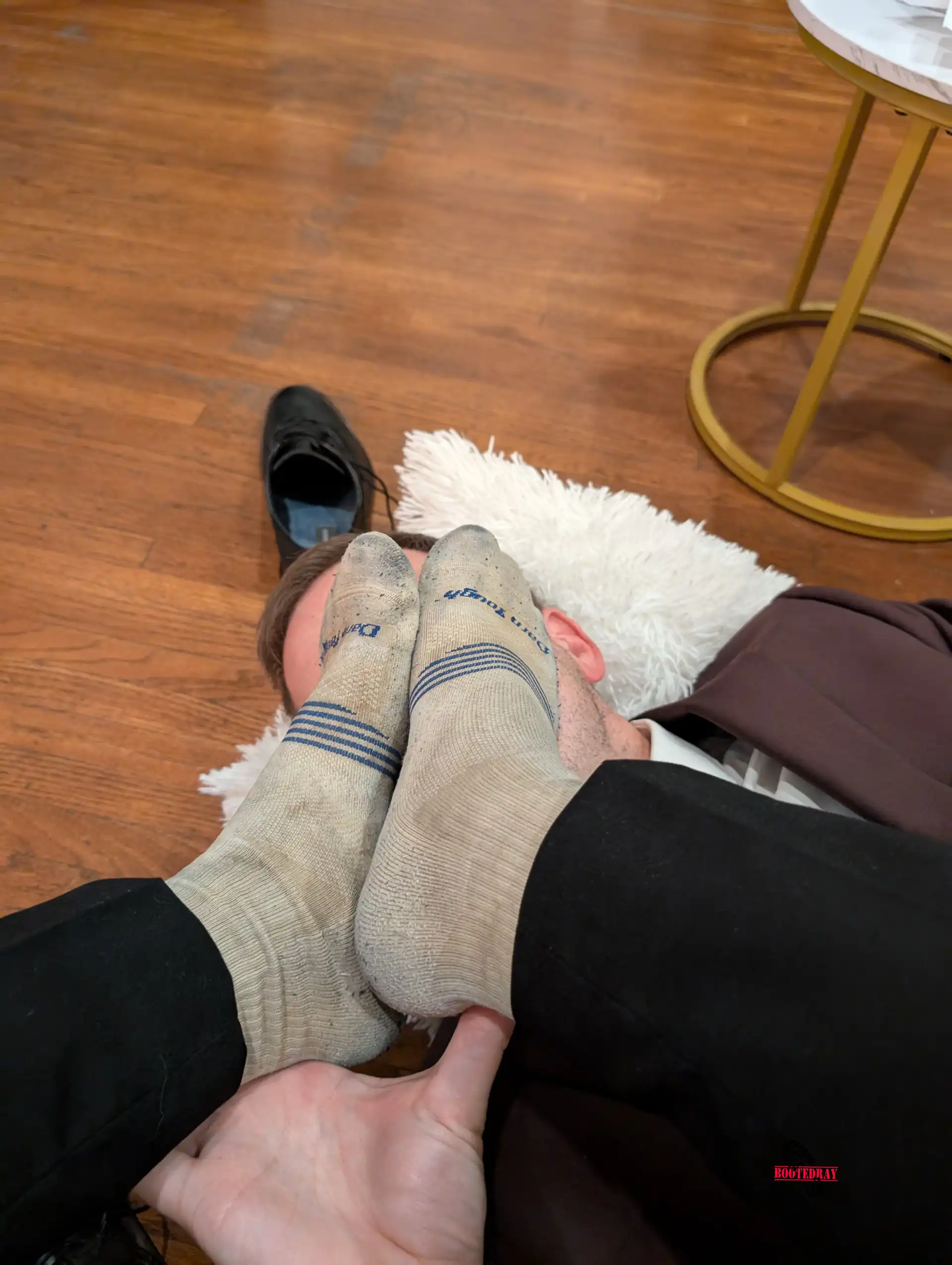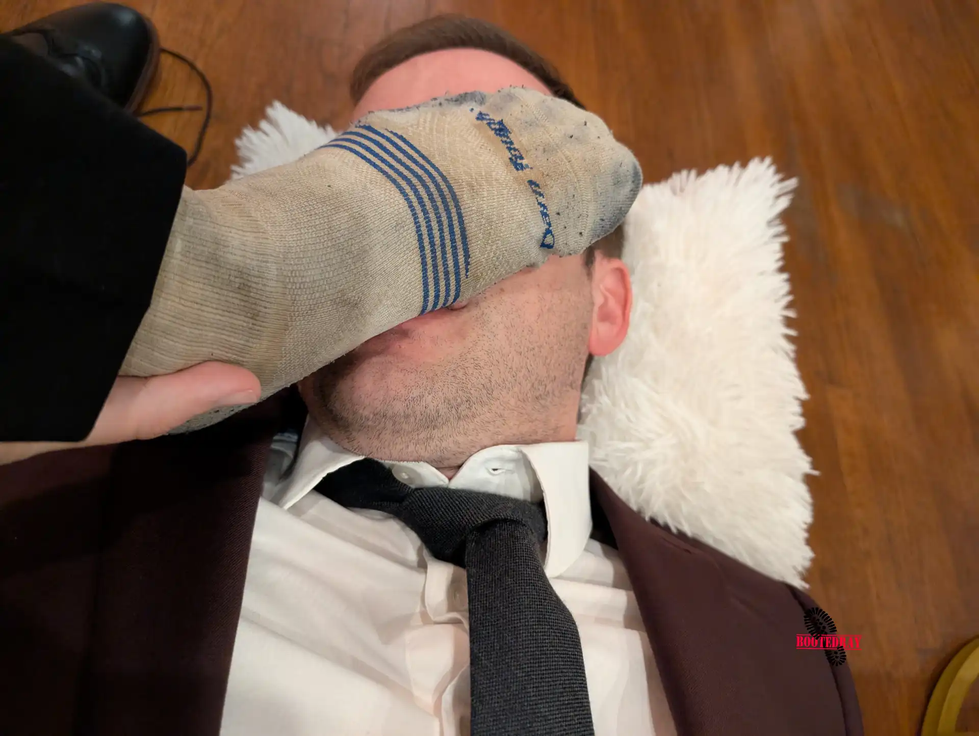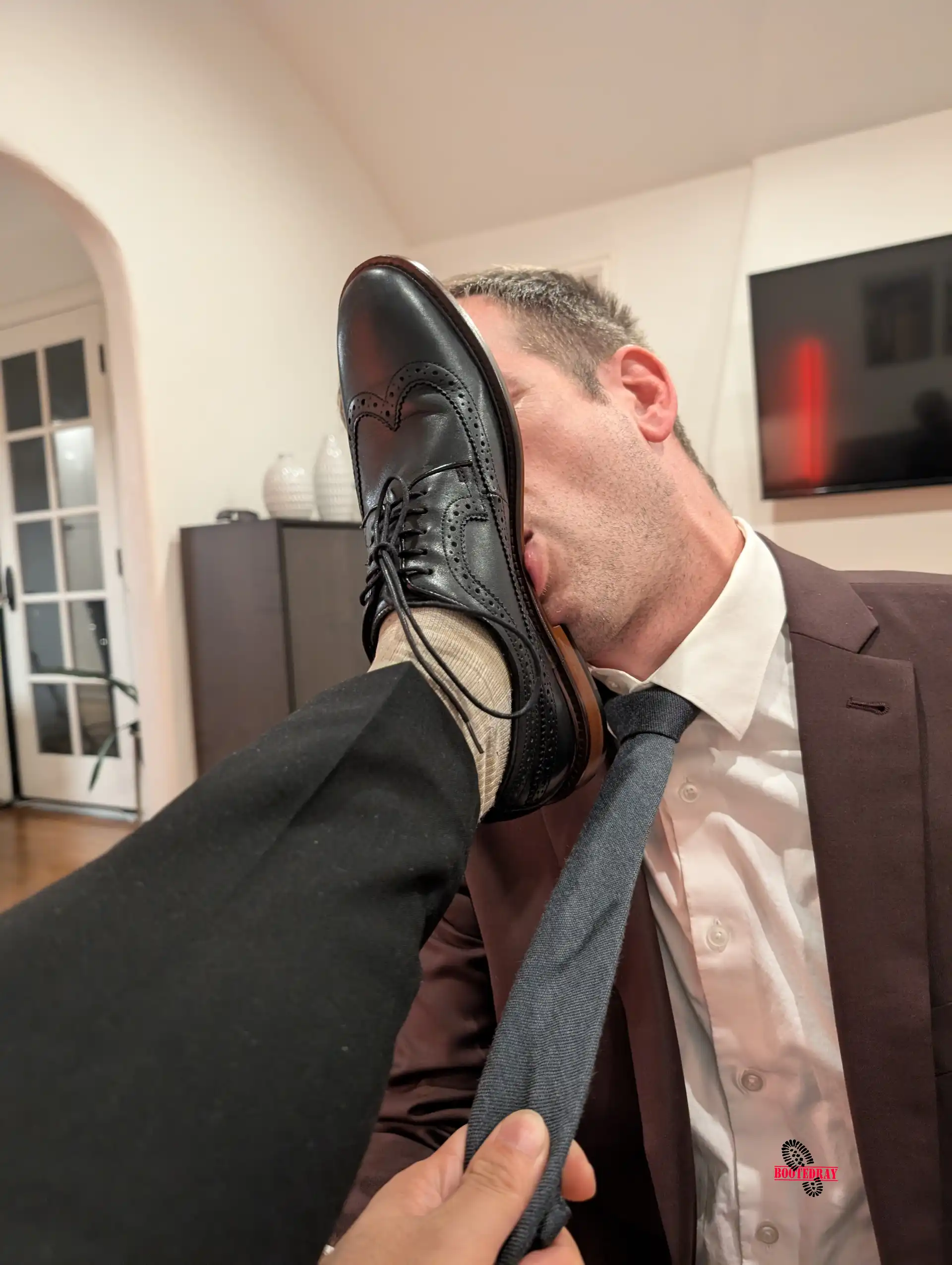 Holding my slave’s tie while it cleans my shoes. I know I should have worn the black socks to match my black leather shoes. But I don’t have any stinky black socks at the moment, so I wore my stinky, smelly “white” socks instead.