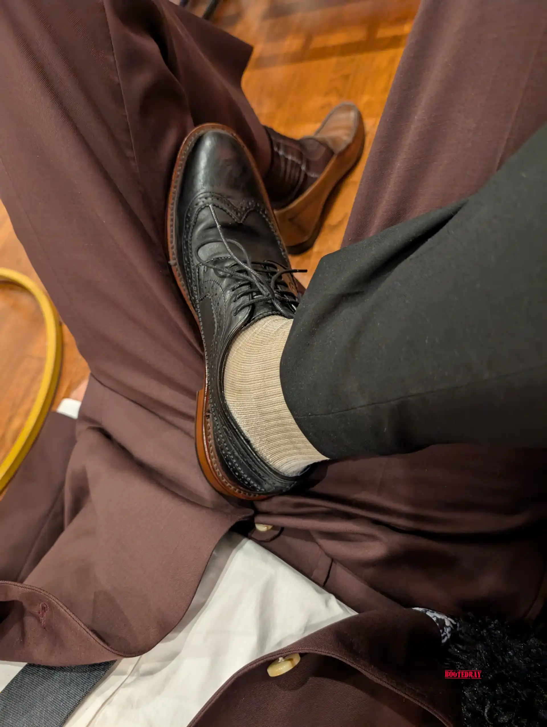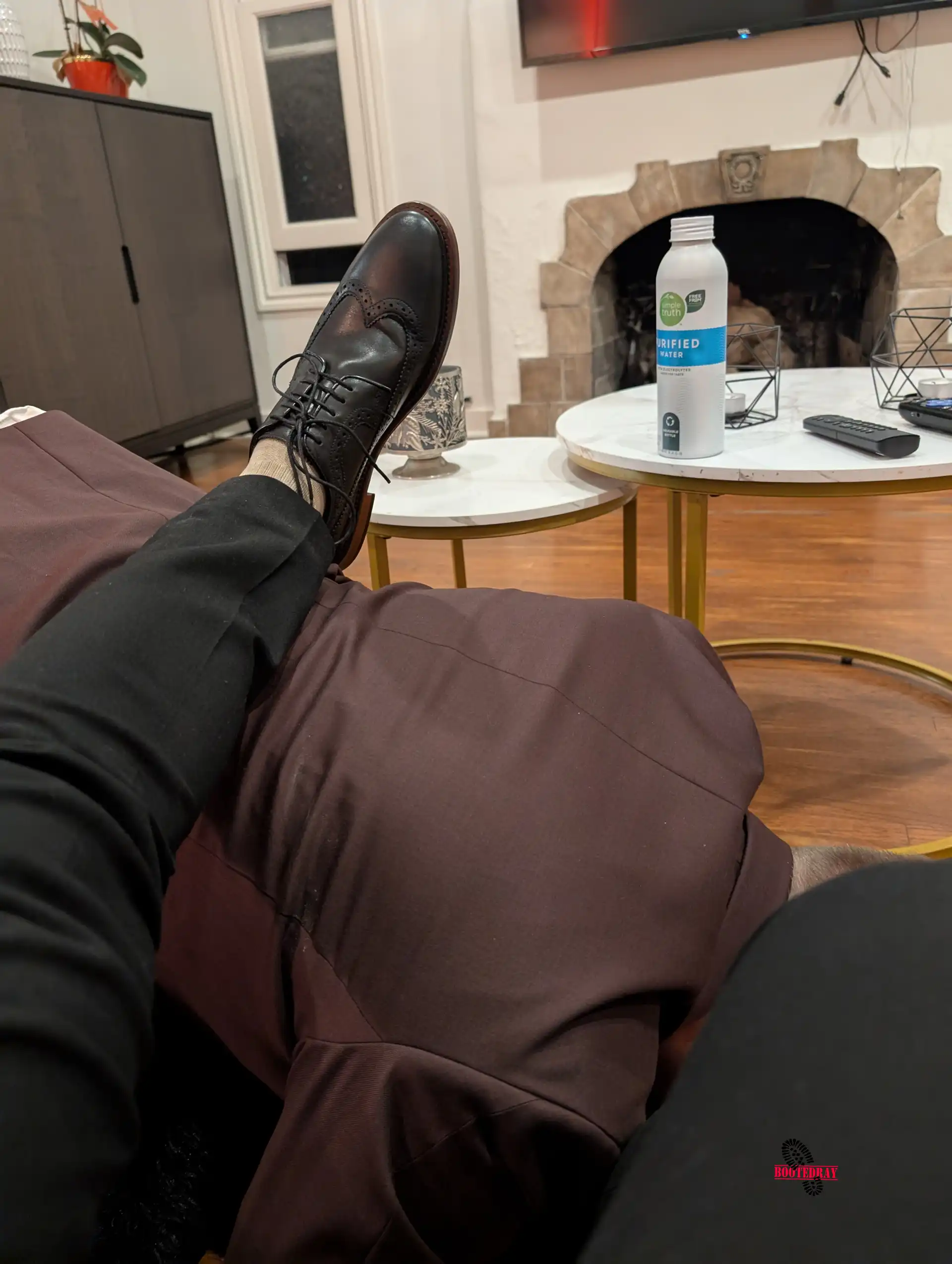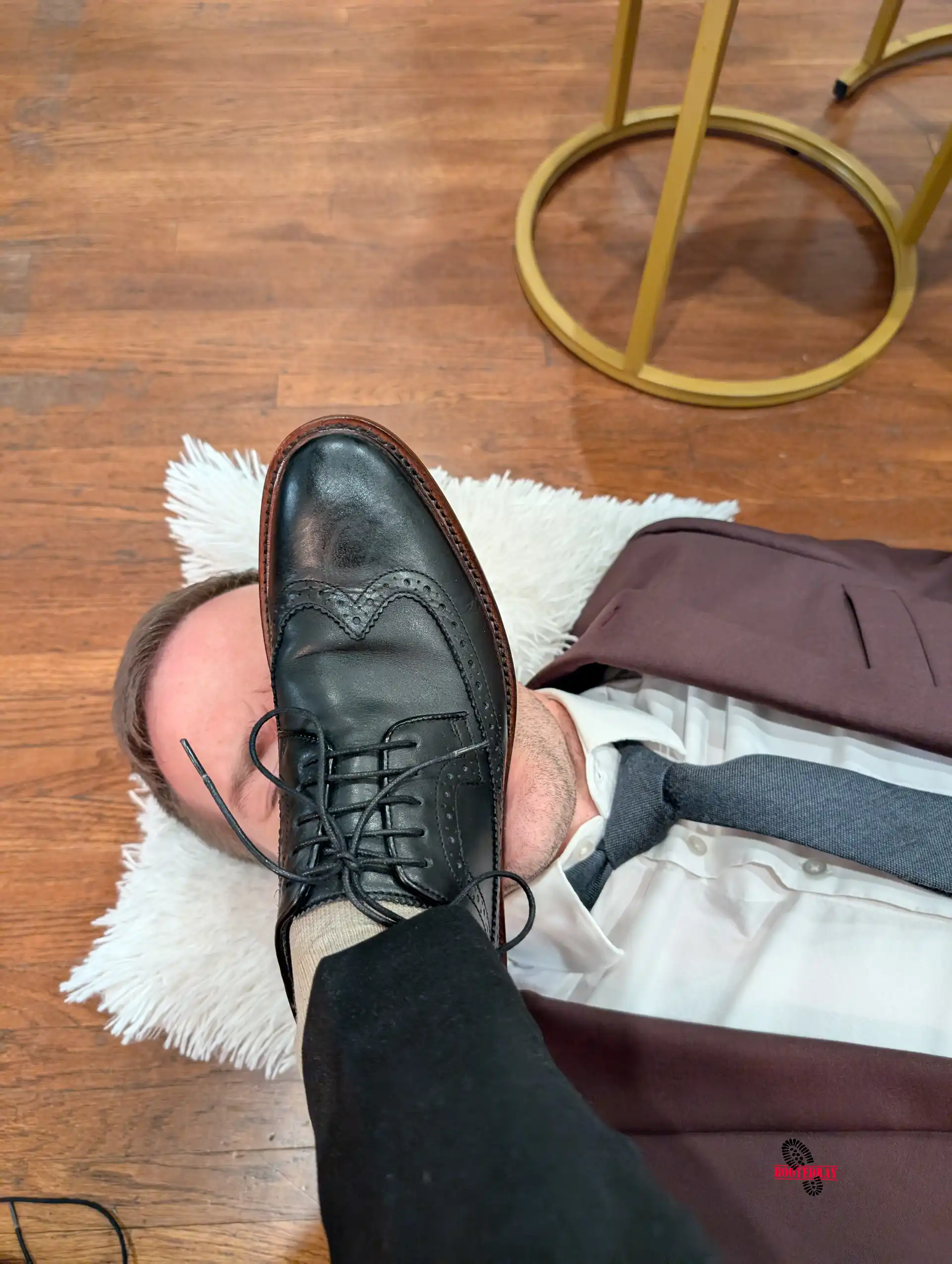 Holding my slave’s tie while it cleans my shoes. I know I should have worn the black socks to match my black leather shoes. But I don’t have any stinky black socks at the moment, so I wore my stinky, smelly “white” socks instead.